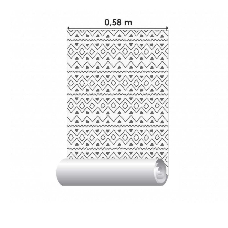 Papel de Parede Adesivo com estampa monocromática étnica de padrões indígenas na orientação horizontal. Combina com ambientes contemporâneos, rústicos e jovens.